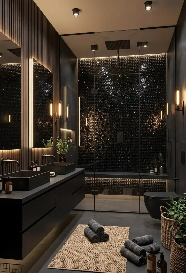 Obsidian Mosaic and Matte Ebony Luxury Dark Bathroom Idea