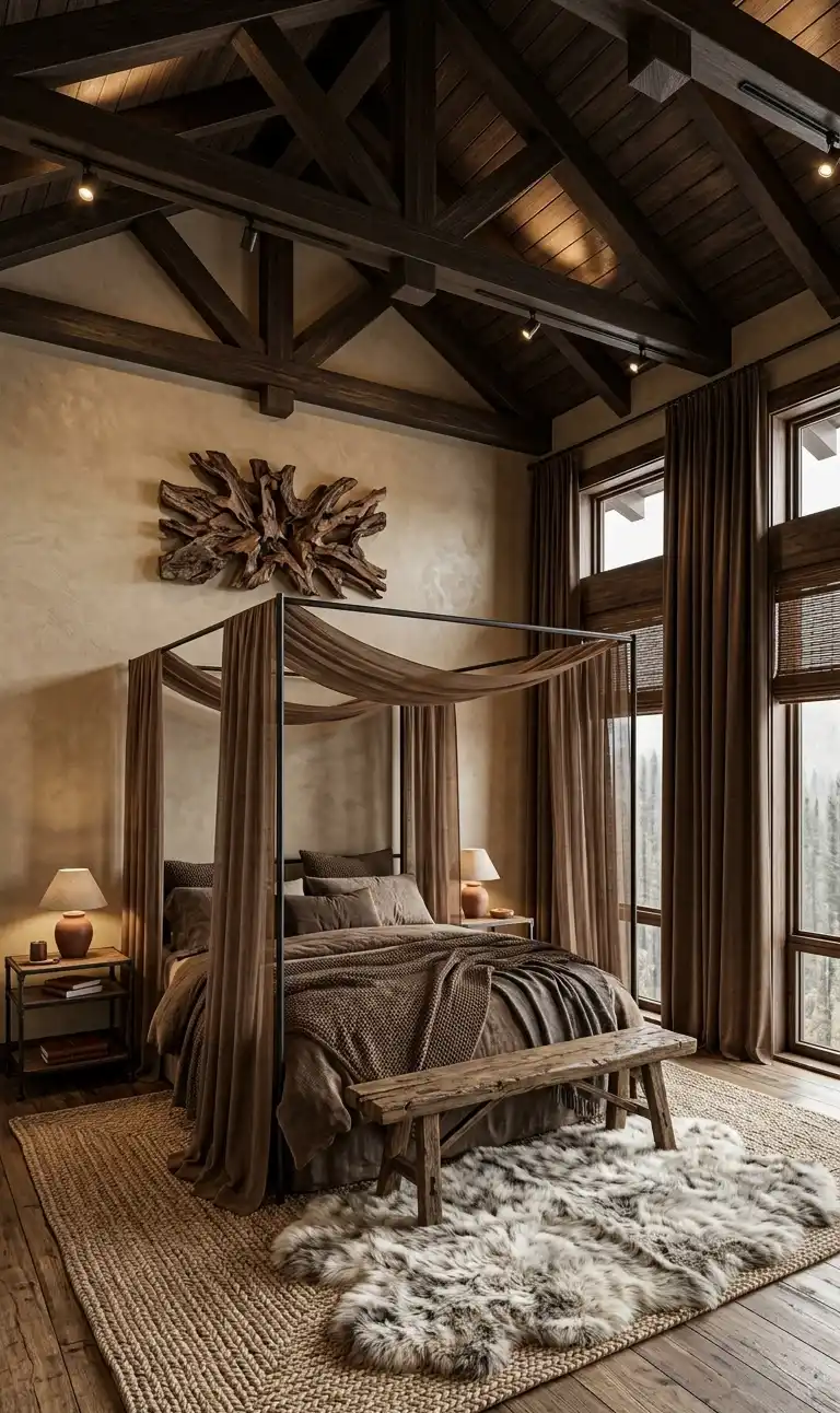 Organic Textures and Vaulted Timber Joists in a Brown Luxury Bedroom Design Retreat