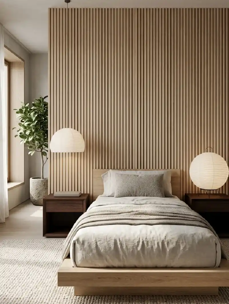 Precision Linear Wood Detailing in a Light Oak Japandi Bedroom Idea with Tactile Textiles