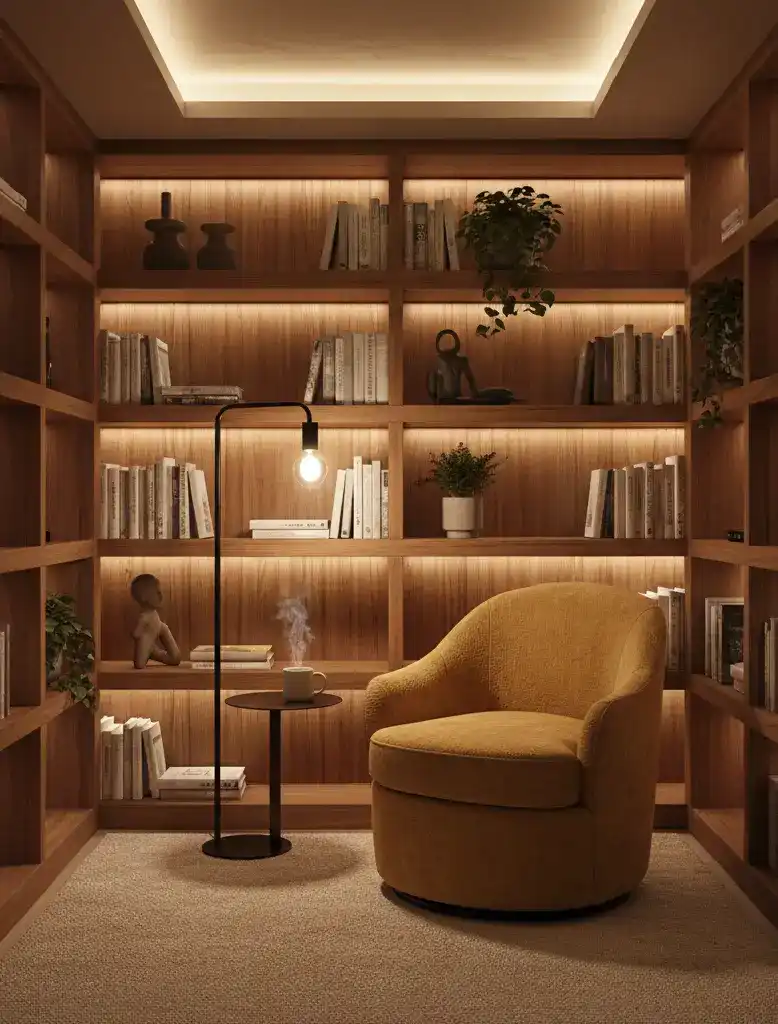 A small, intimate alcove with a built-in bookshelf in warm ...