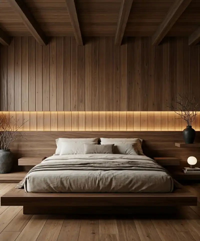 Reclaiming Raw Wood Textures: A Structural Japandi Bedroom Idea Featuring Recessed Cove Lighting