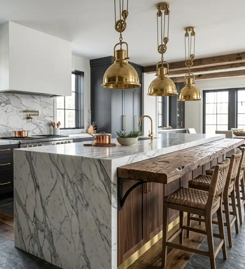 Rustic Kitchen Idea with Cantilevered Marble Island