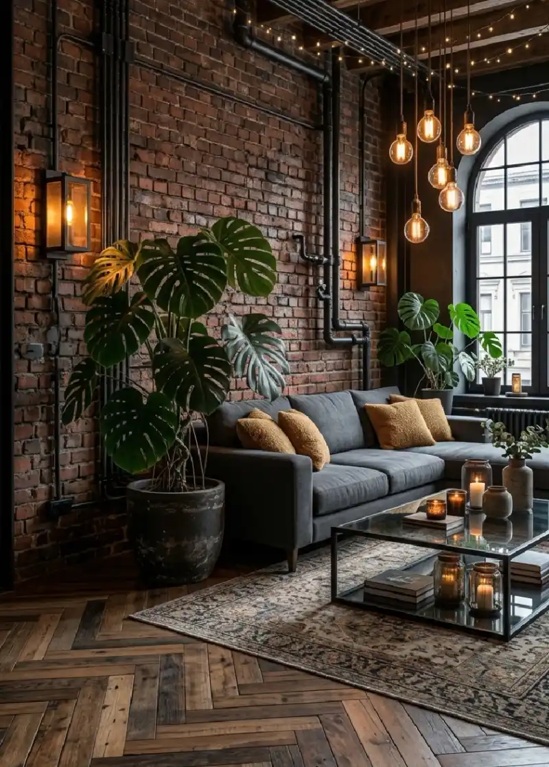 Rustic Living Room Idea: Biophilic Industrialism with Exposed Conduits