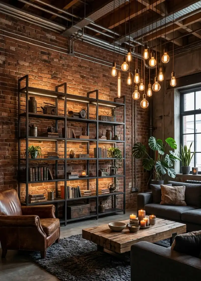 Rustic Living Room Idea: Exposed Red Brick with Integrated Steel Shelving