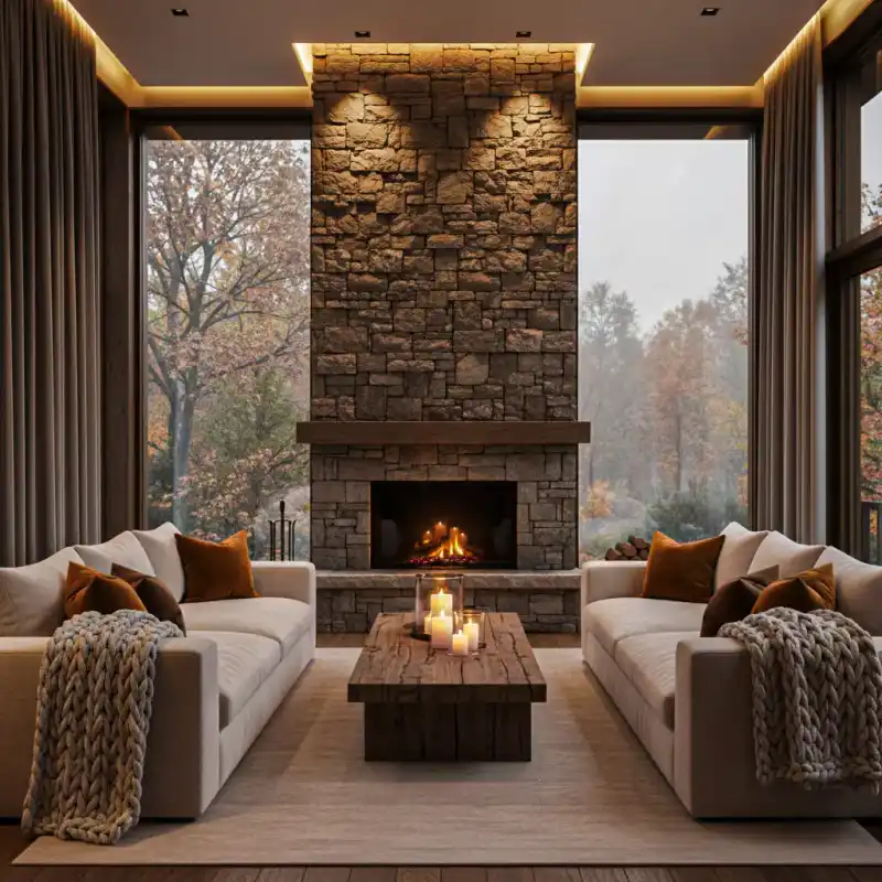 Rustic Modern Living Room with a Warm Stone Fireplace