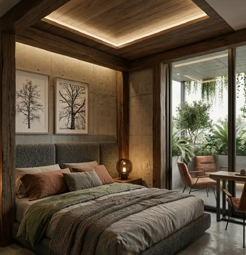 Rustic Modern Luxury Bedroom: Earthy Tones and Textural Layering