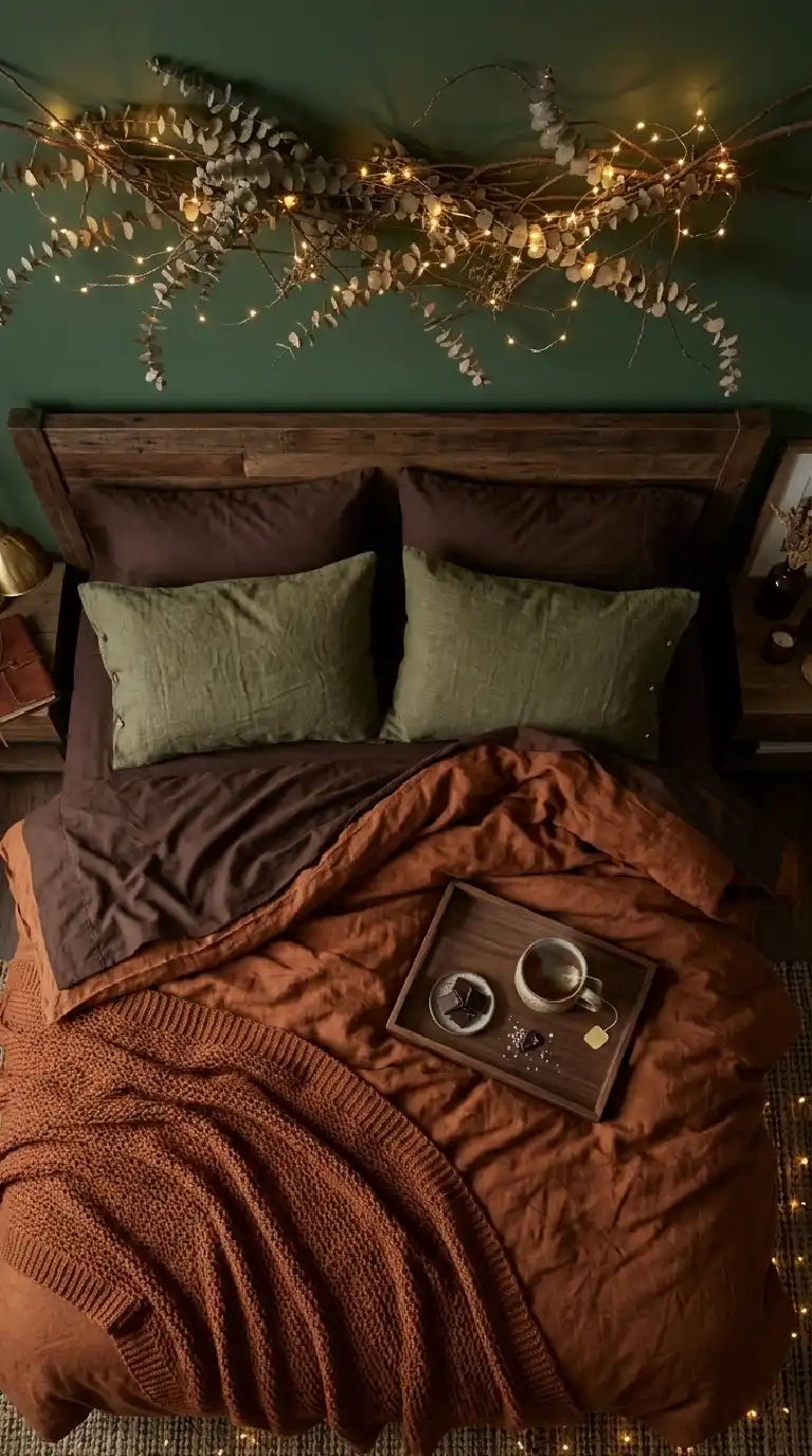 A moody, nature-inspired bedroom that feels tucked away in a...