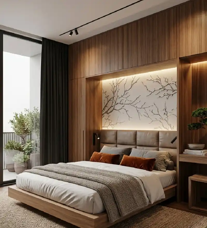 Seamless Built-in Wardrobes and Backlit Murals for an Integrated Japandi Bedroom Idea