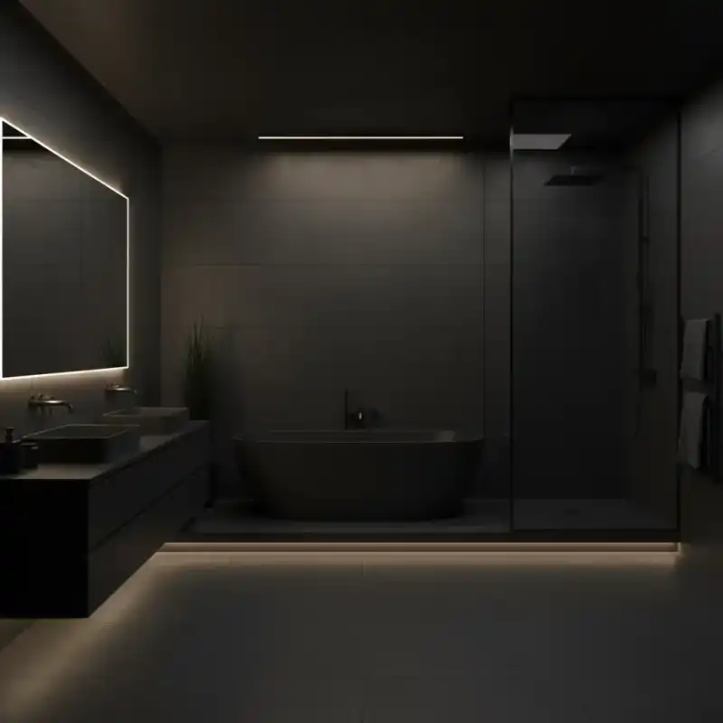 A modern bathroom with bold black tones, minimalist fixtures...