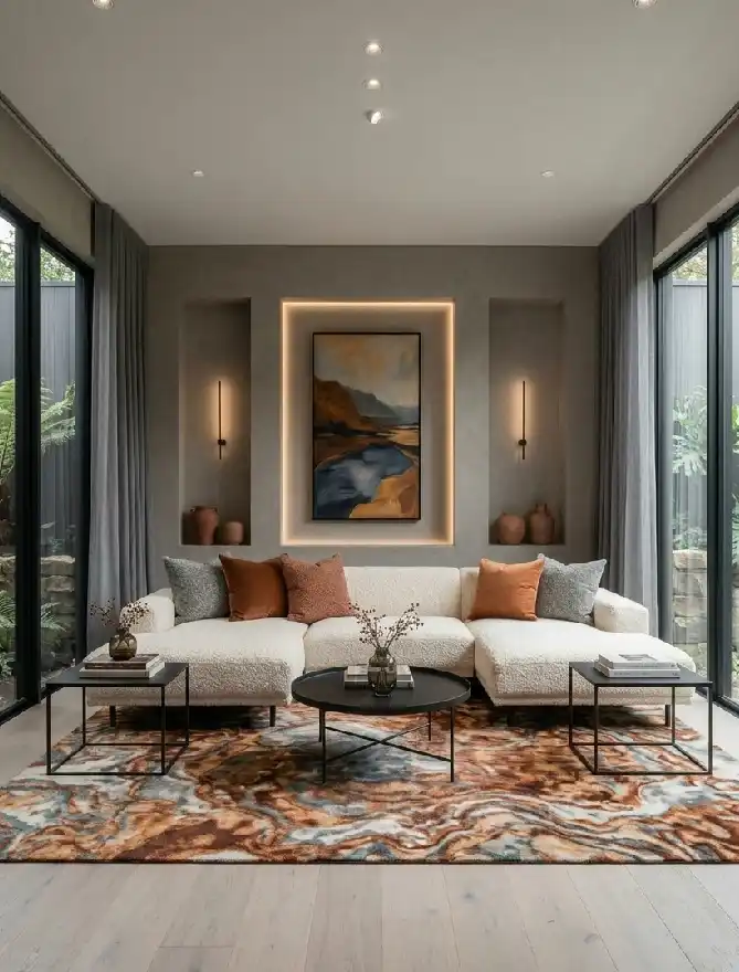 Small Minimalist Living Room with Geometric Symmetry and Layered Textiles