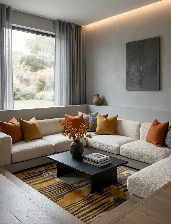 This layout utilizes a low-profile sectional upholstered in...