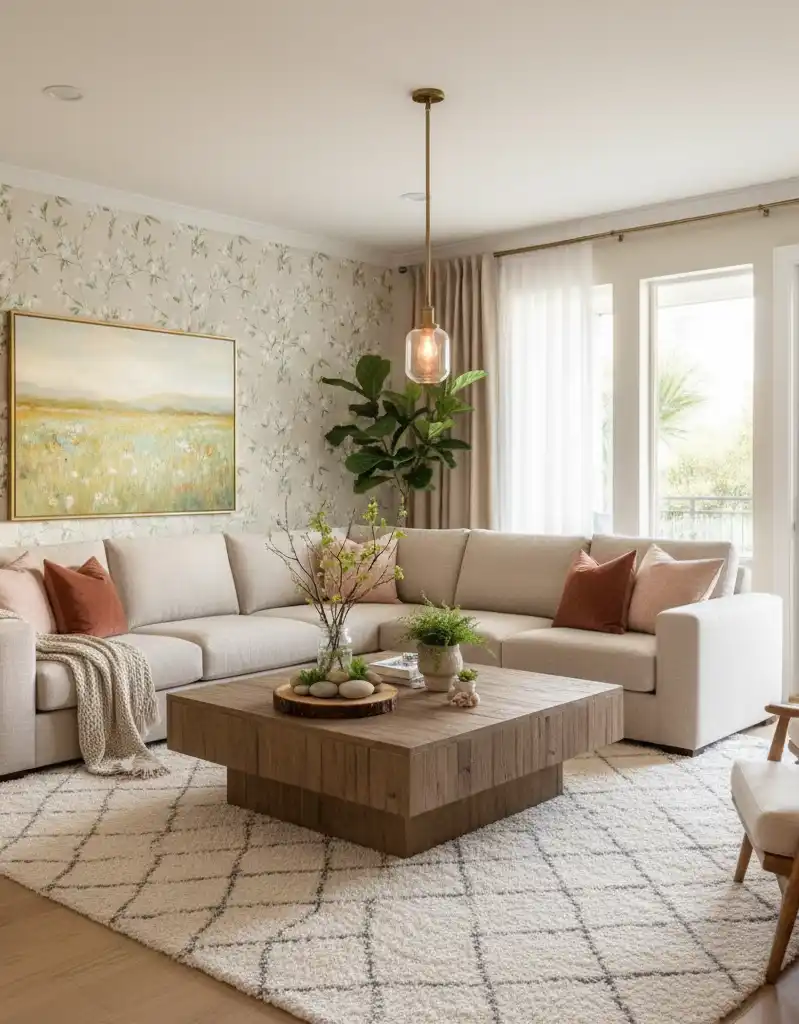 Sophisticated Spring Living Room L-Shaped Comfort with Botanical Elegance