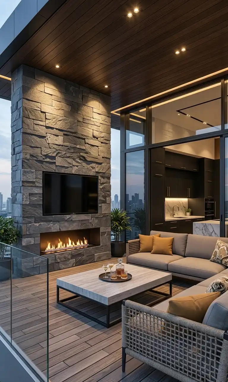 Stone-Clad Feature Wall: Luxury Modern Balcony Idea for High-End Kitchen Extensions