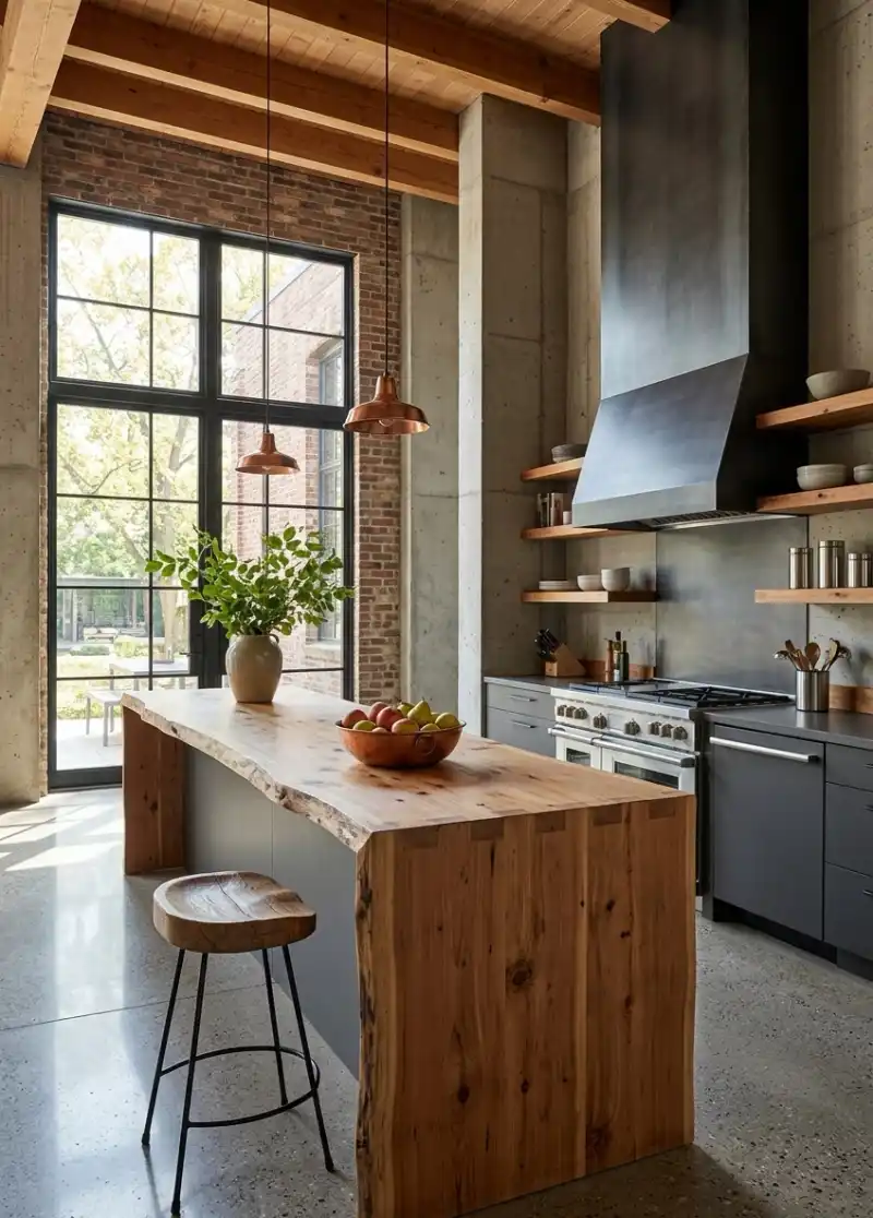 Structural Masonry and Live-Edge Cedar in a Bold Luxury Modern Kitchen Idea