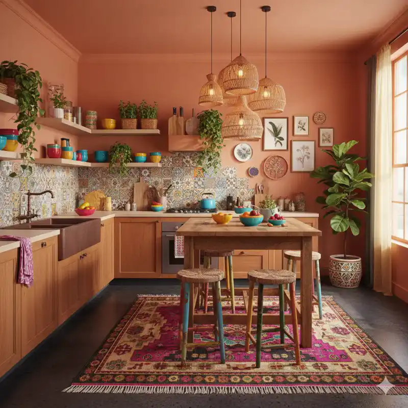 A warm, sunlit kitchen with natural wood textures, earthy to...