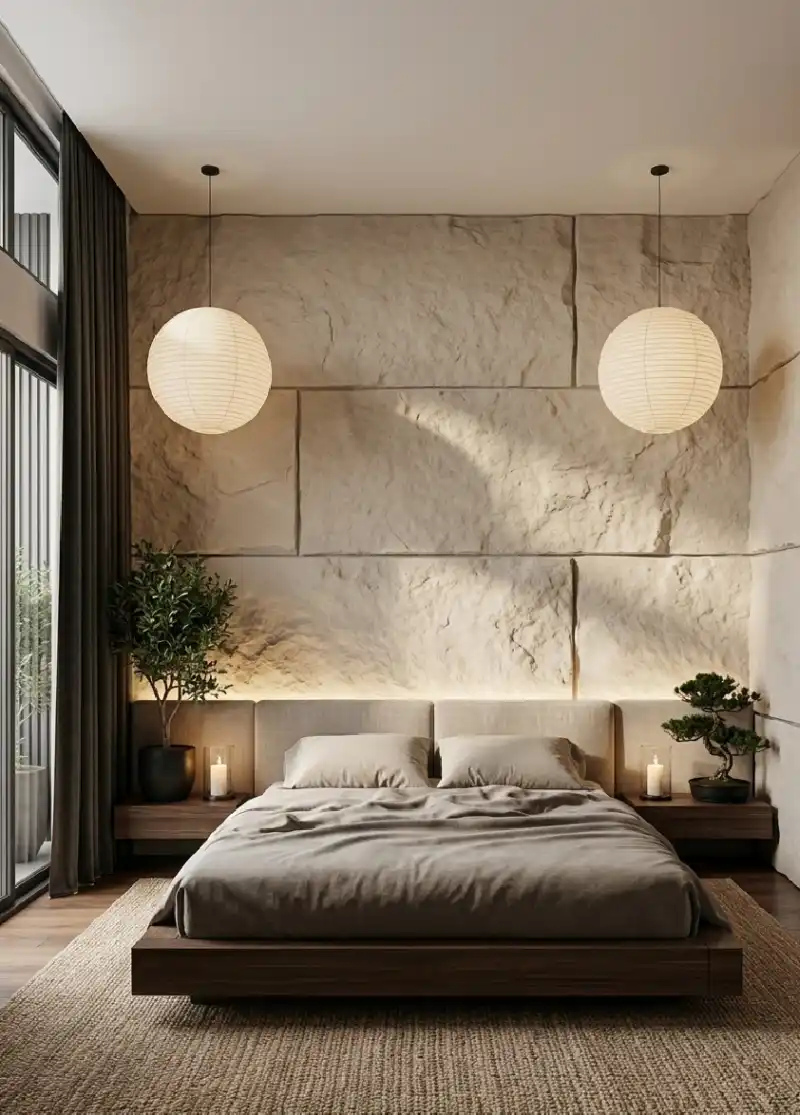 Symmetrical Earth-Tone Spatial Planning for a Monolithic Stone and Timber Japandi Bedroom Idea
