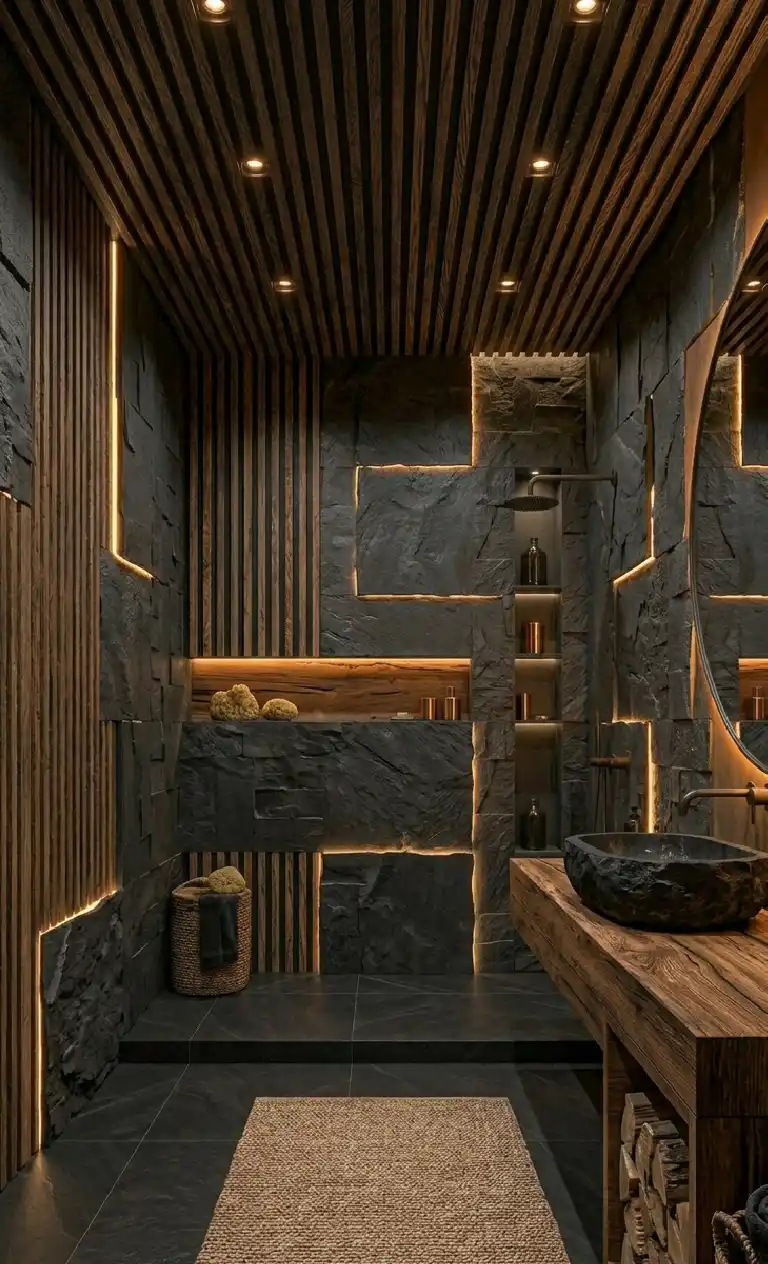 Tectonic Plates and Timber Grain: A Luxury Dark Bathroom Idea