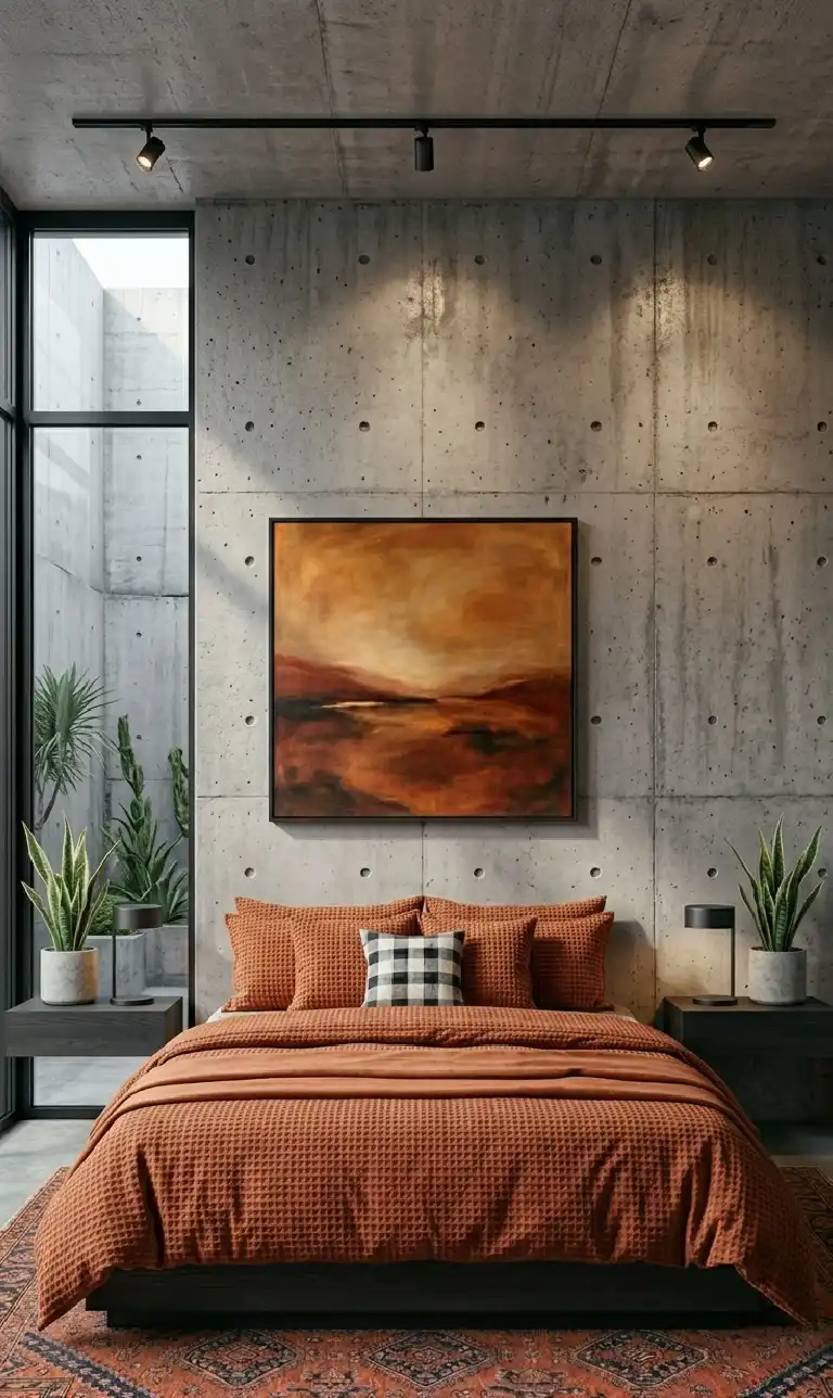 Terracotta & Wood Bedroom Idea: Brutalist Concrete and Warm Terracotta Fusion