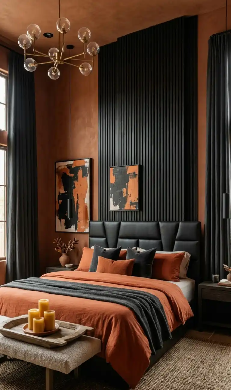 Terracotta & Wood Bedroom Idea: Burnt Sienna Enclosure with Fluted Black Accents