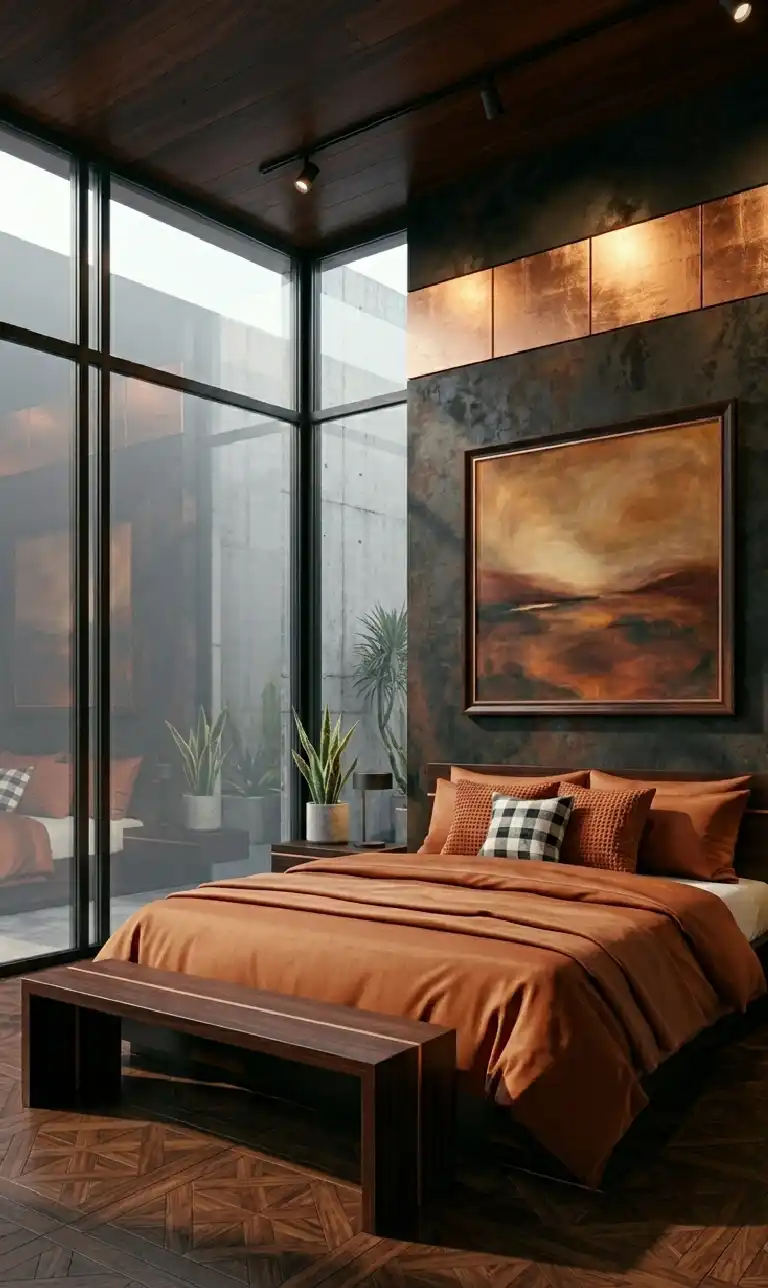 Terracotta & Wood Bedroom Idea: Dark Patina Plaster and Copper-Infused Wood
