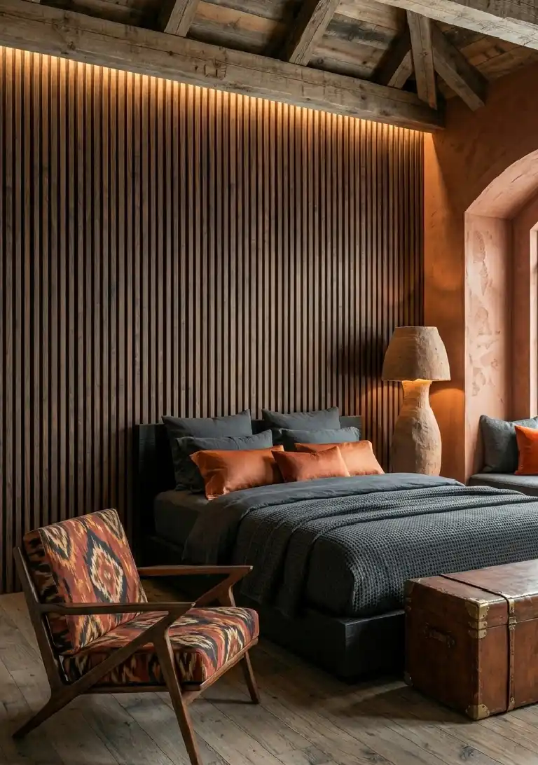 Terracotta & Wood Bedroom Idea: Linear Wood Slatting and Clay Plaster Surfaces