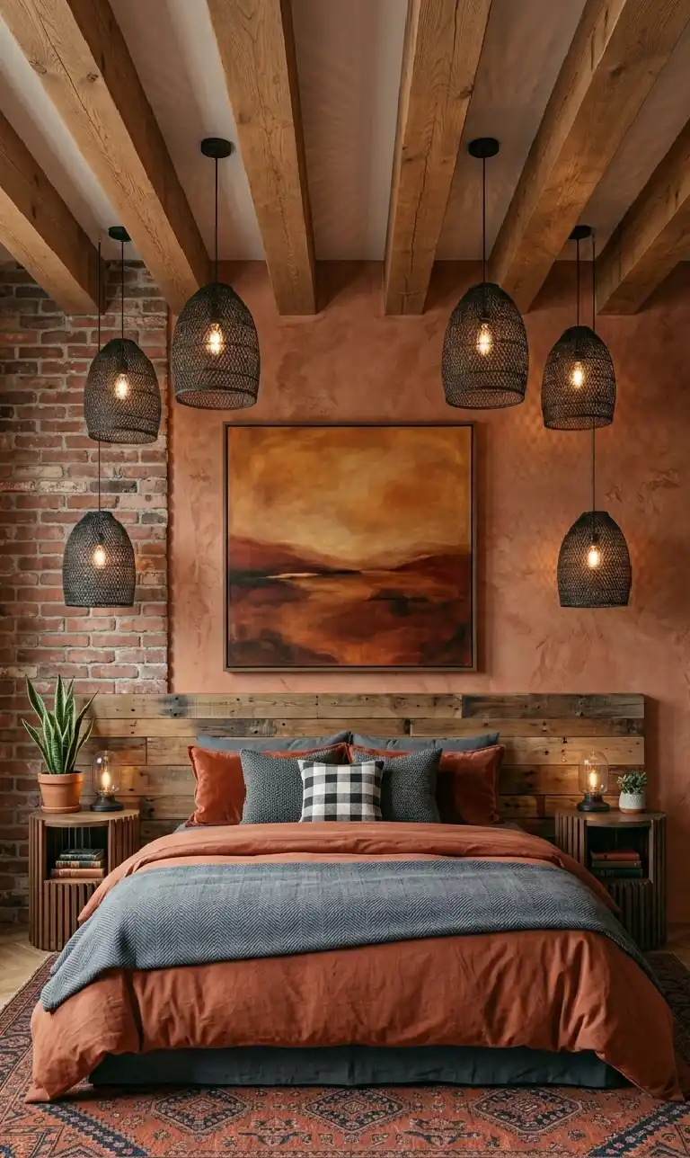 Terracotta & Wood Bedroom Idea: Mixed Media Walls and Reclaimed Wood Headboards