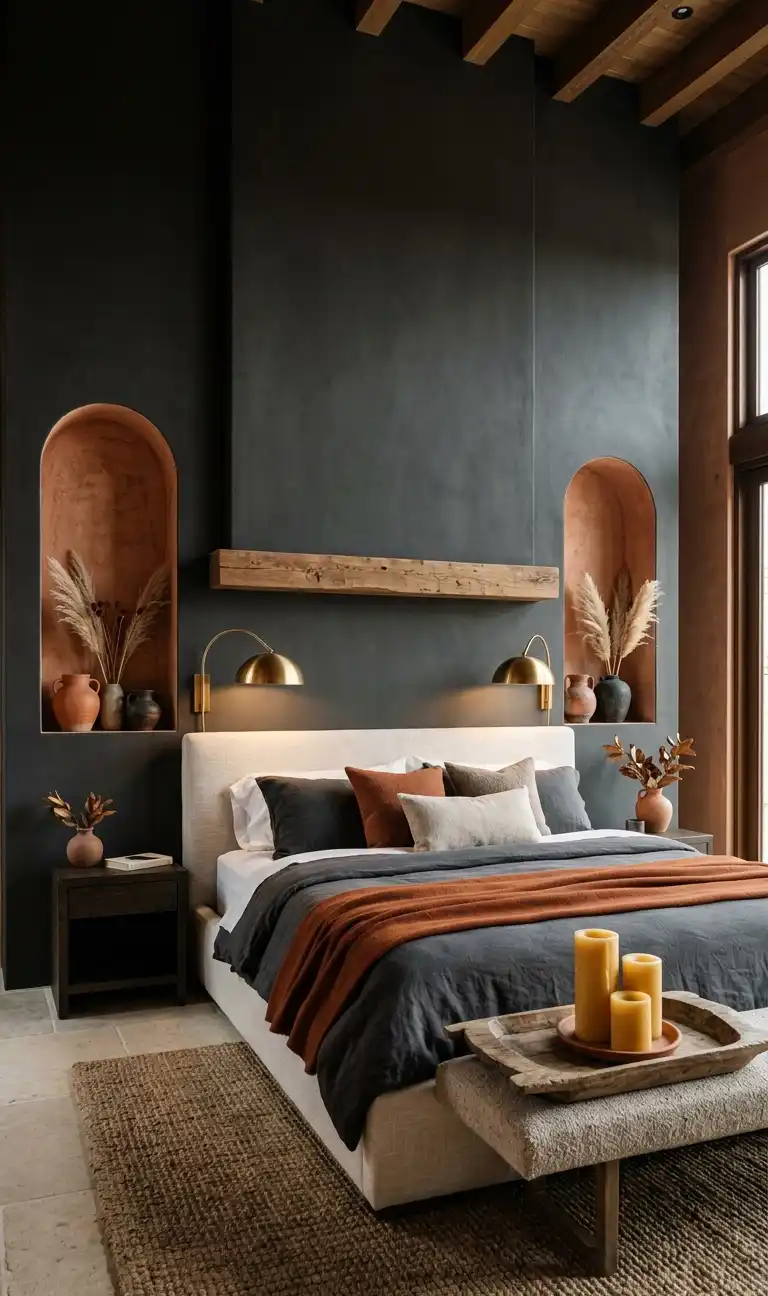Terracotta & Wood Bedroom Idea: Monolithic Charcoal Wall with Recessed Clay Niches