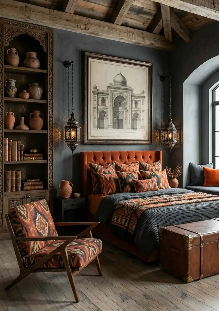 Terracotta & Wood Bedroom Idea: Orientalist Fusion with Carved Wood Joinery