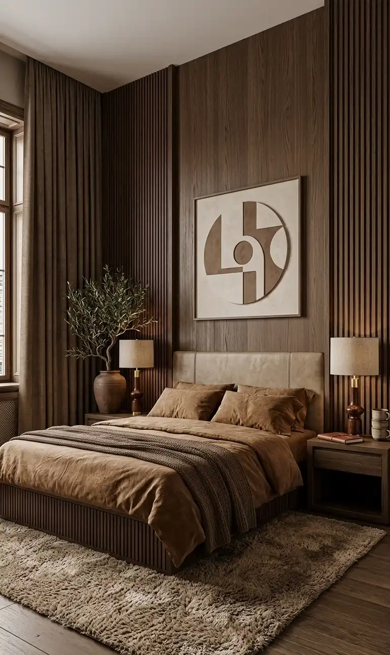 Textural Symmetry and Ribbed Paneling for a Brown Luxury Bedroom Design Concept