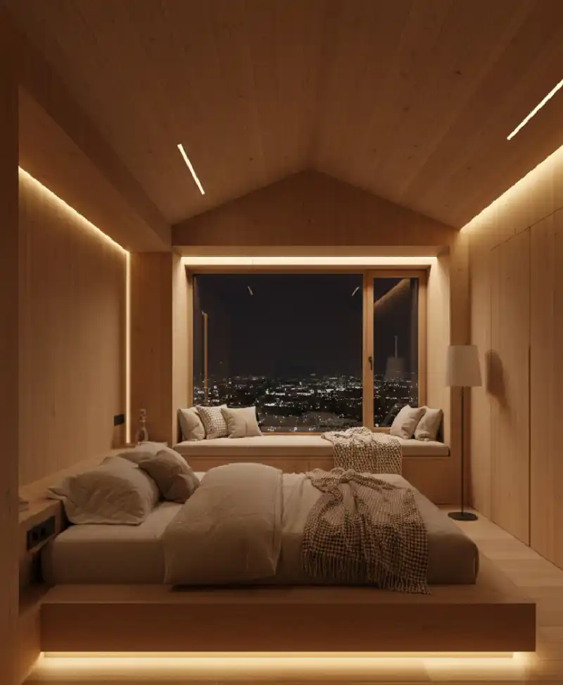 A master bedroom designed as a seamless wooden sanctuary. Th...