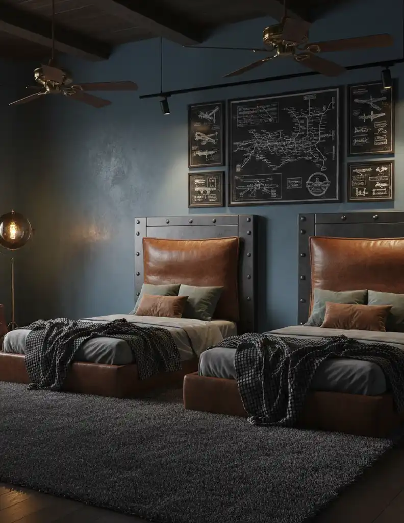 Inspired by vintage aircraft hangars, this room features bed...