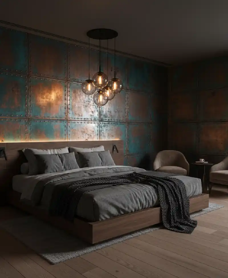 A master bedroom featuring a floor-to-ceiling accent wall ma...