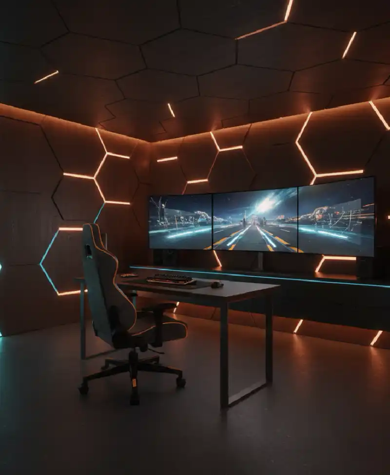A futuristic yet warm gaming space. Acoustic hexagonal wood ...