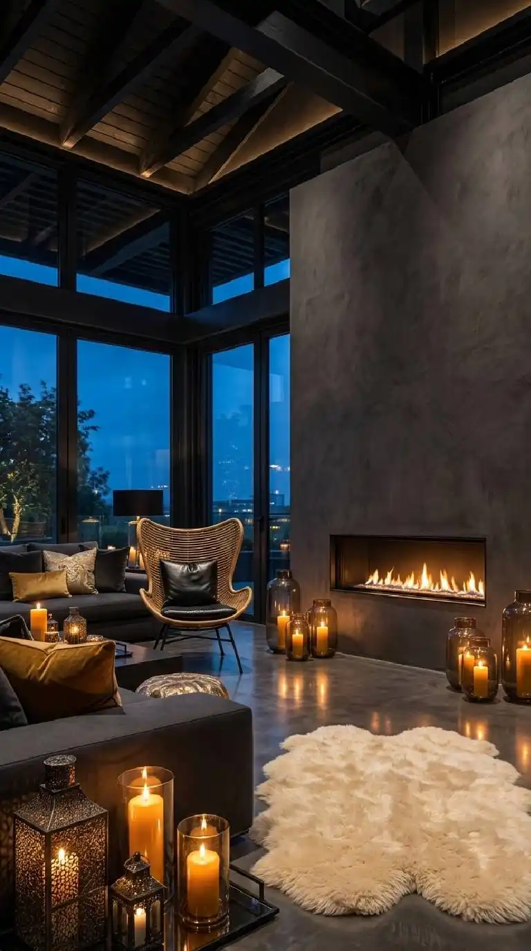 A dark, moody living room with charcoal grey plaster walls. ...