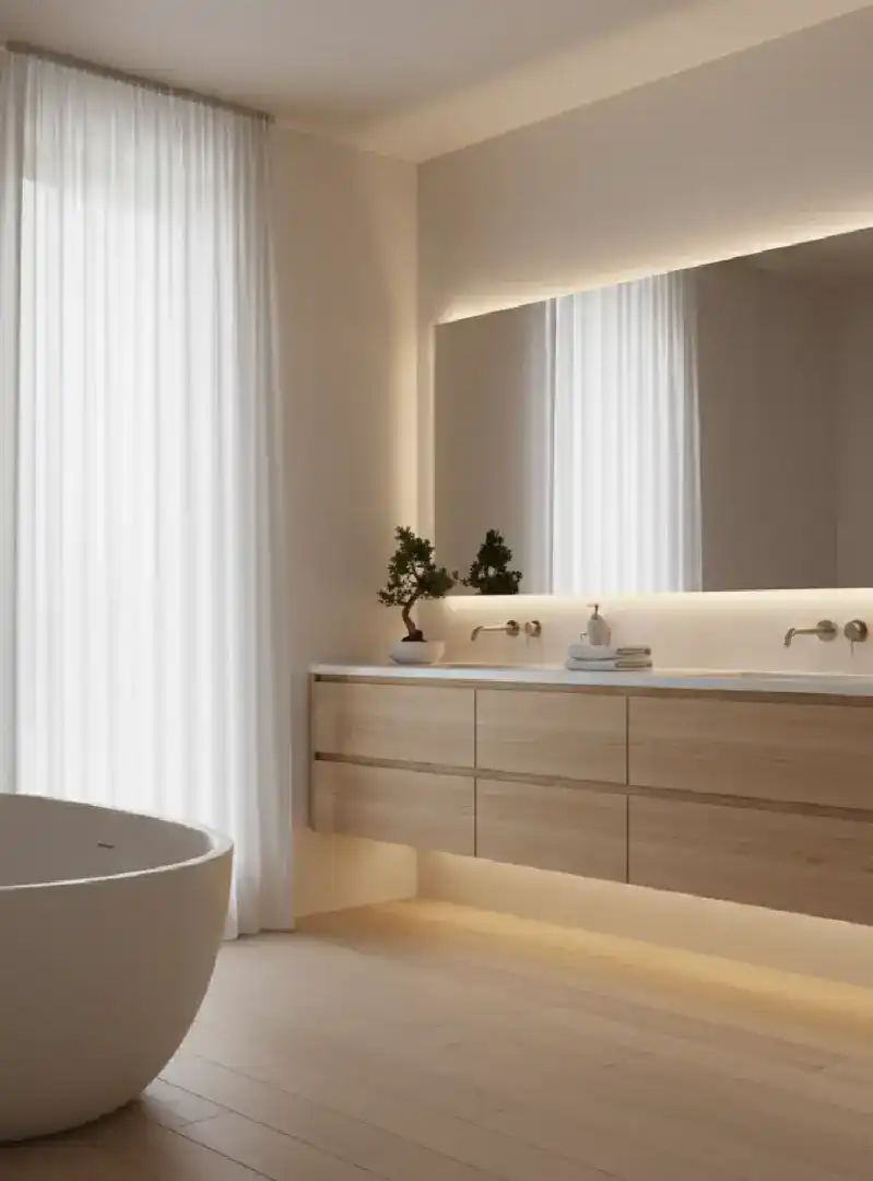 This space focuses on minimalist tranquility, featuring a wa...