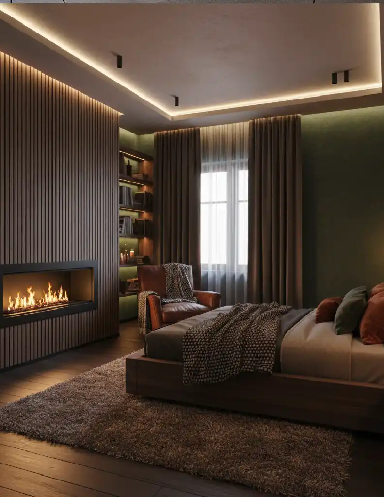 A bedroom that feels like a luxury cabin, featuring a dark w...