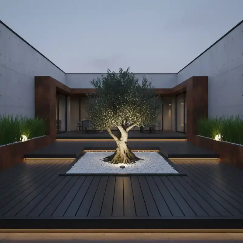 This design uses a combination of raw concrete walls and wea...