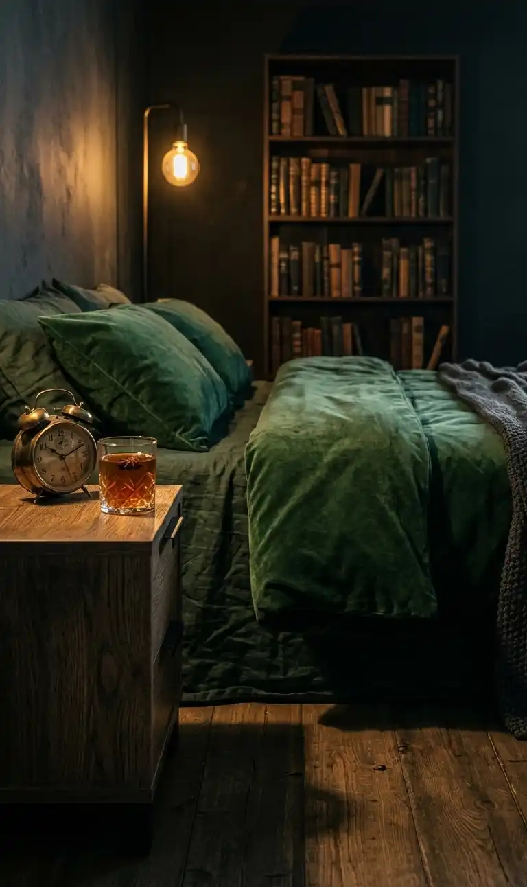 A low-angle, cinematic shot focused on the foot of a bed, em...