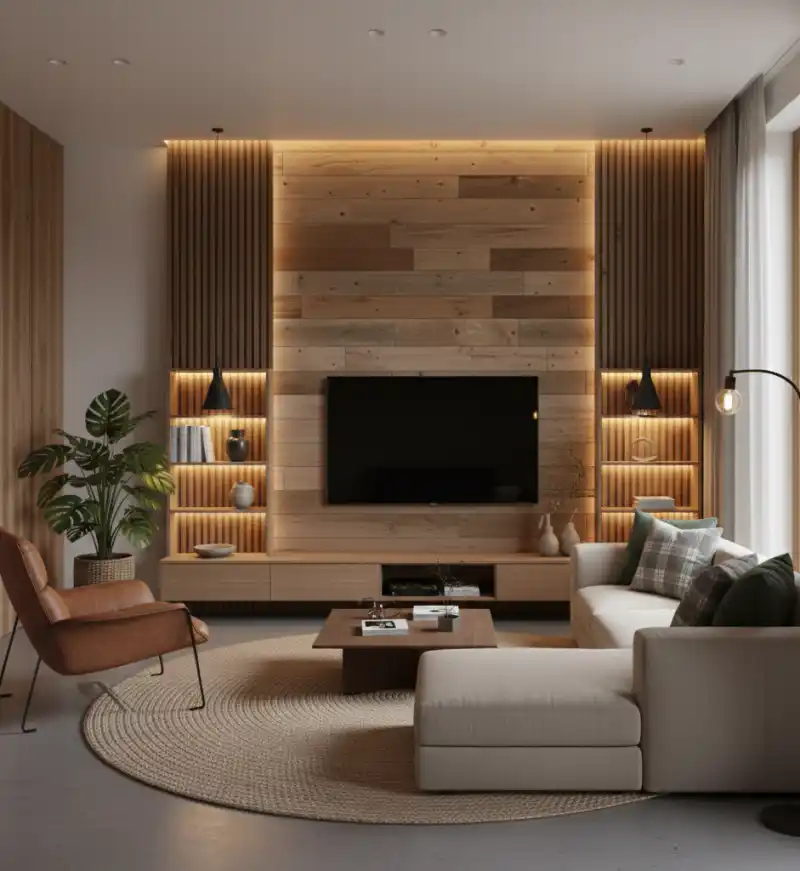 The Modern Hearth A Sophisticated Living Space Defined by Wooden Textures