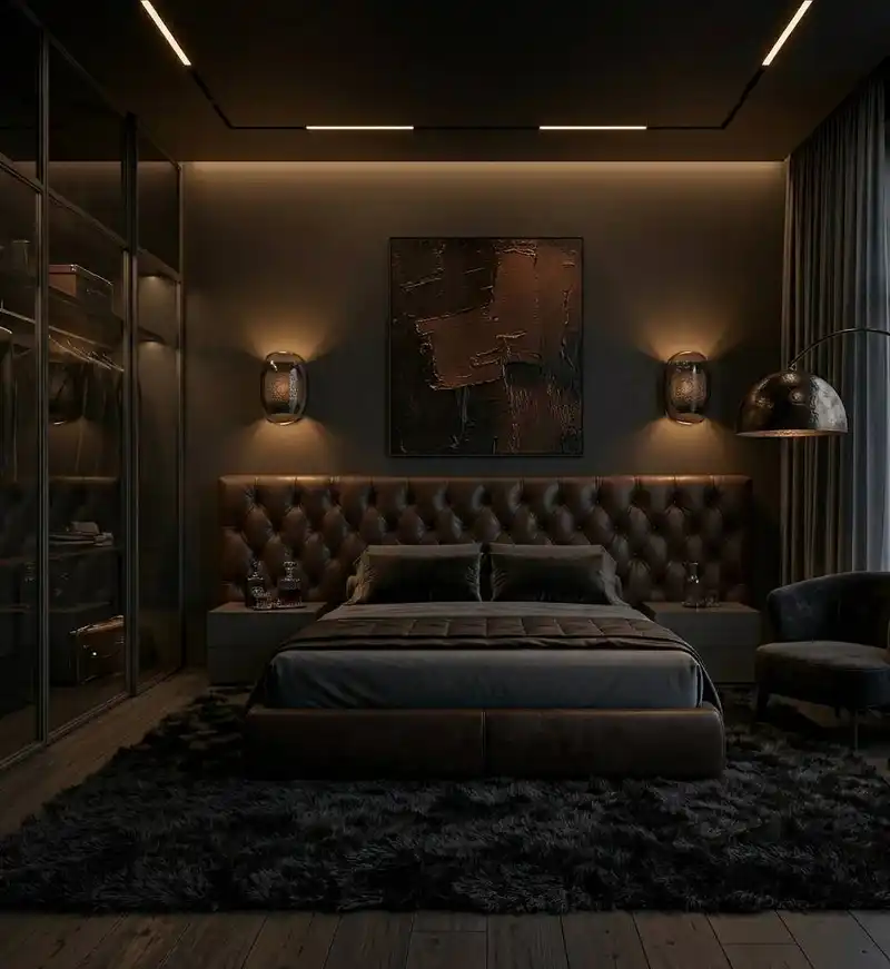 A cinematic bedroom design centered around a tufted dark-cho...
