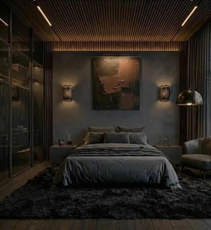 A masculine, powerful space featuring dark concrete-textured...