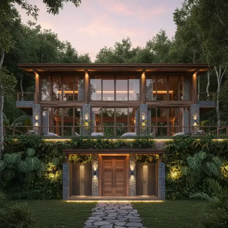 Organic architecture using raw timber and river stones. The ...