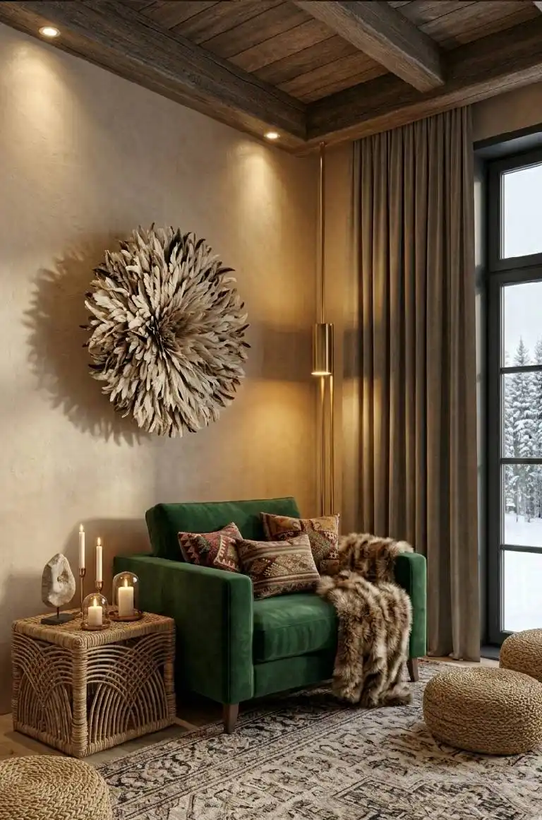 An intimate corner focused on a deep emerald green velvet ar...