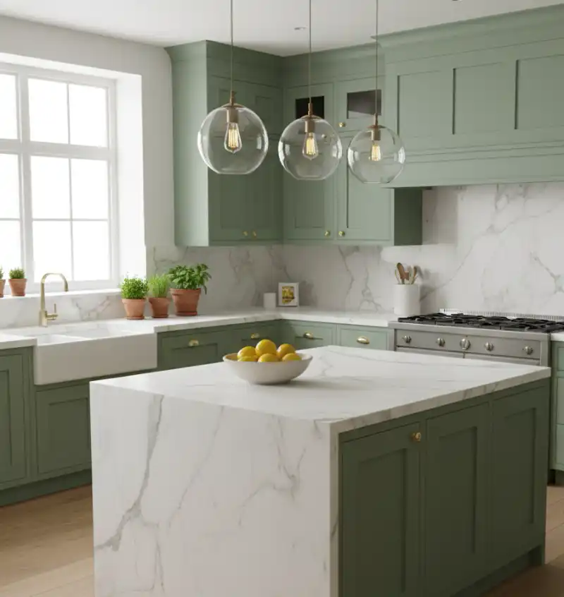 A spacious kitchen featuring muted sage green cabinetry with...