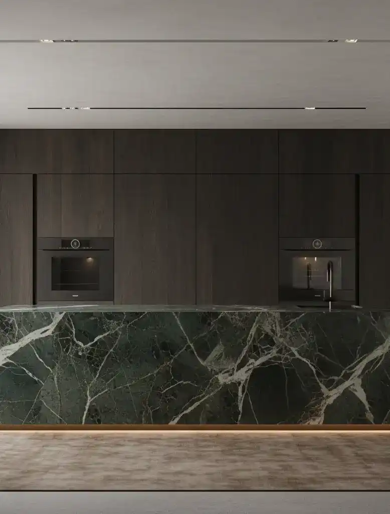 A kitchen dominated by a massive, hand-carved Verde Alpi mar...