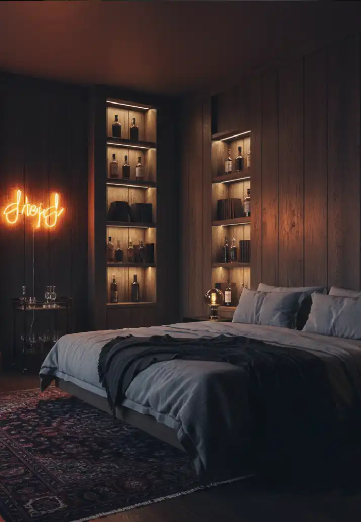 A masculine and cozy den-style bedroom. The walls are wrappe...