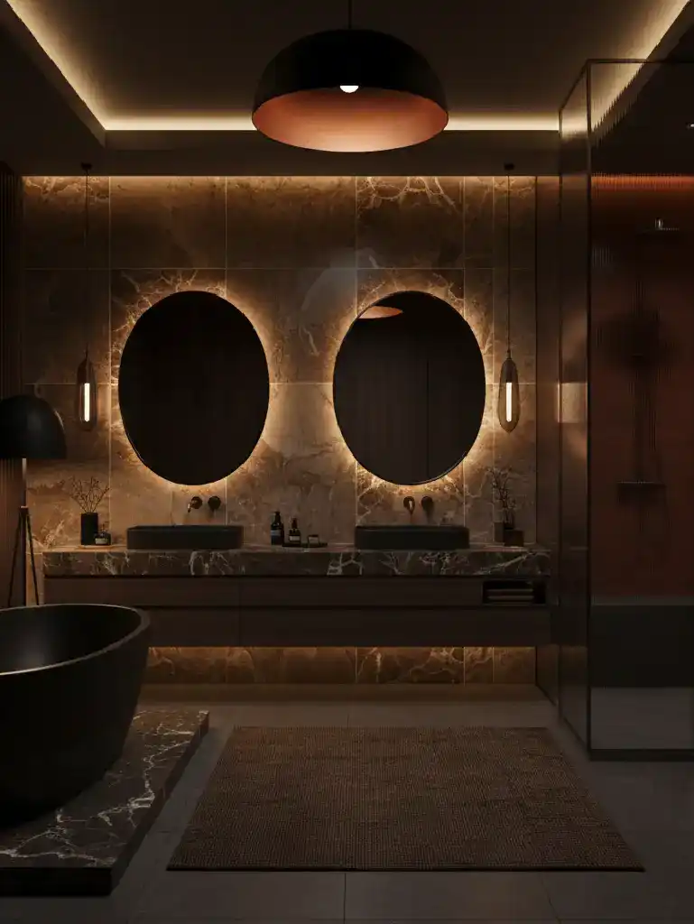 An opulent and moody bathroom designed for ultimate relaxati...