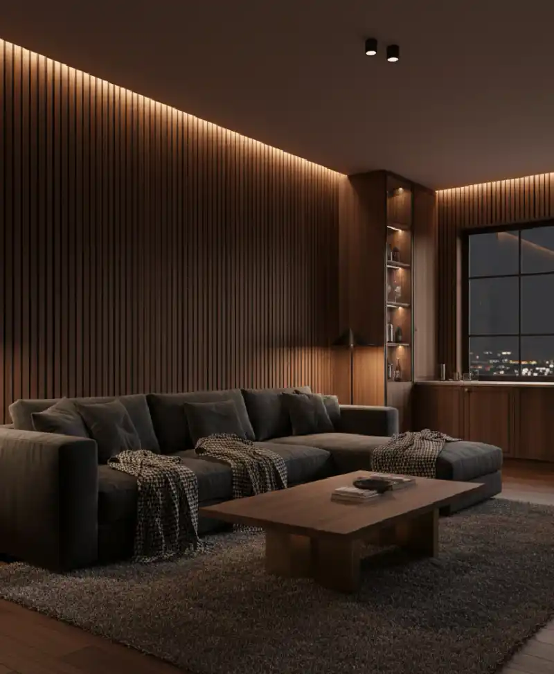A sophisticated and cozy space dominated by rich walnut text...