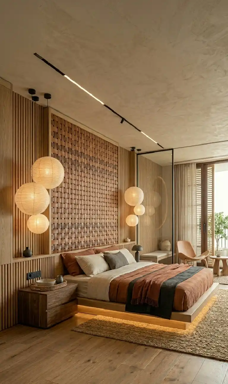 The Woven Canopy and Structural Slat Ceilings: Japandi Bedroom Idea