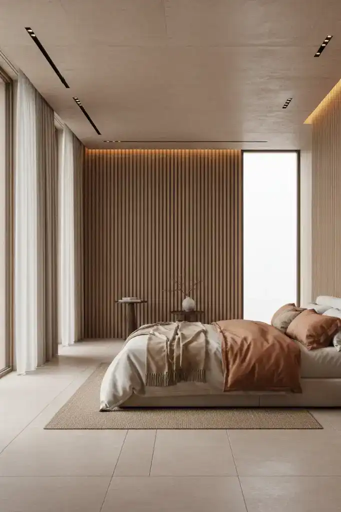 An extreme minimalist bedroom with walls containing hidden s...